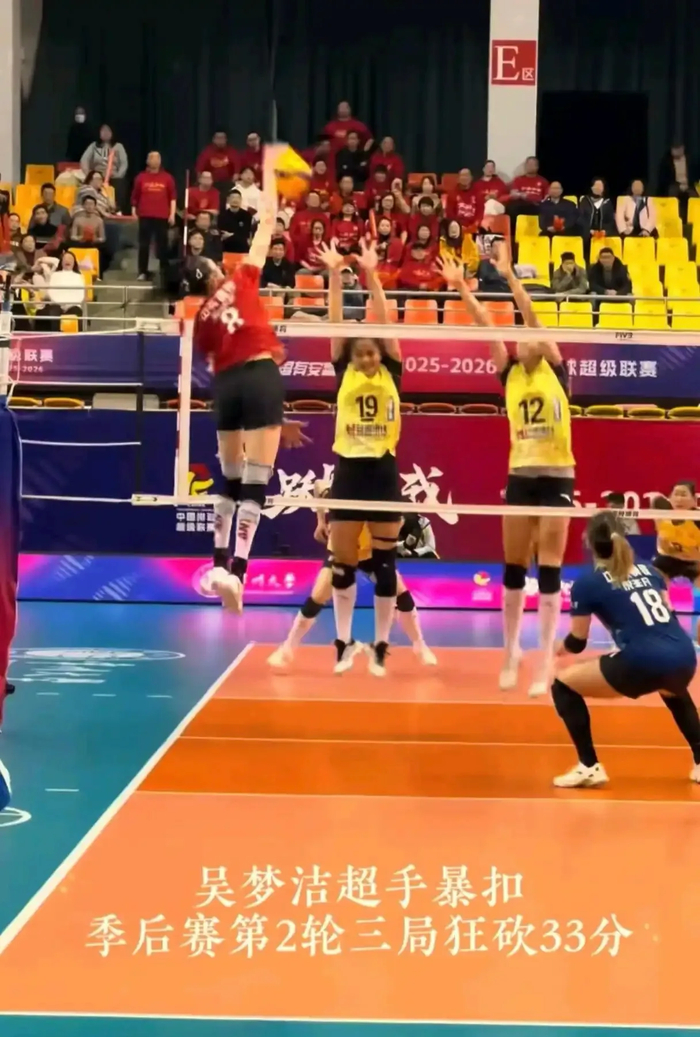 女排联赛季后赛山东vs江苏,吴梦洁再次打出现象级表现:三局狂轰33分,得分超队友总和,超手进攻频频越过标志杆,弹跳高度、爆发力直逼俄罗斯重炮马尔科娃,肉眼可见的天赋碾压。可越是看得过瘾,球迷越揪心——这样恐怖的输出背后,是江苏女排在透支未来、死薅核心。