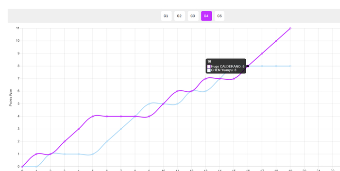 这场比赛的转折点就是第四局,开场雨果4-1领先,陈垣宇追到4-4后,两人打到5-5、6-6、7-7、8-8,关键分上陈垣宇先是一个低级失误,随后雨果反手拿分,陈垣宇直接0-3崩盘。这一局雨果拿下后,决胜局陈垣宇的士气完全没有了。