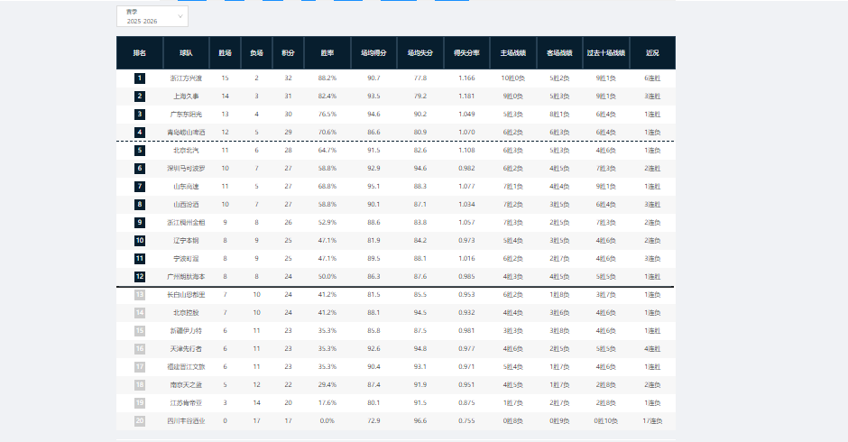 广厦男篮:15胜2负,胜率88.2%,排名第1