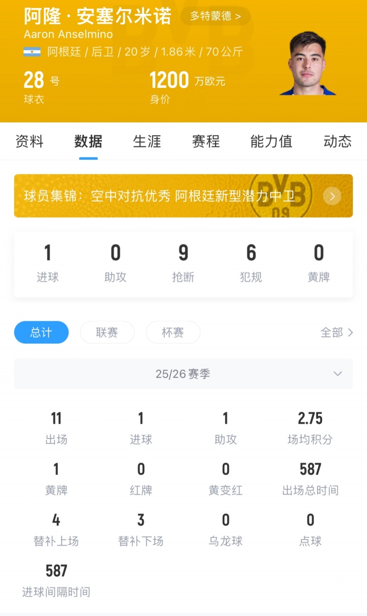 安塞尔米诺现年20岁,阿根廷后卫。本赛季他为球队出场11次,贡献1粒进球和1次助攻,目前其德转身价为1200万欧。